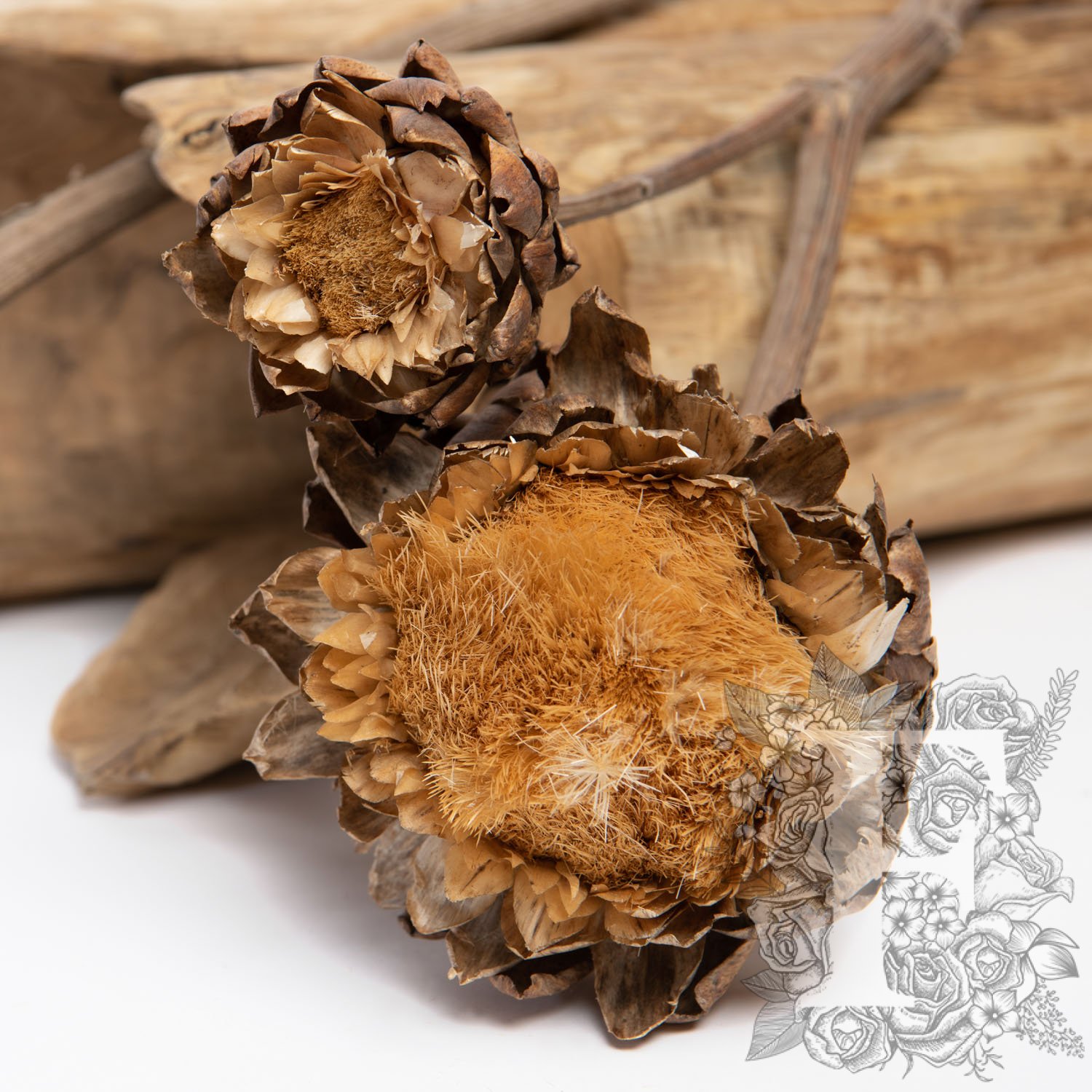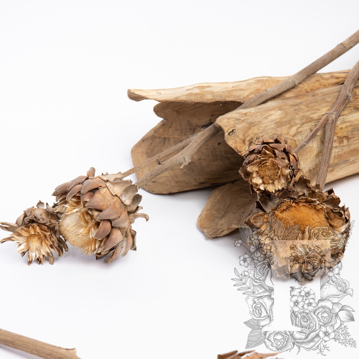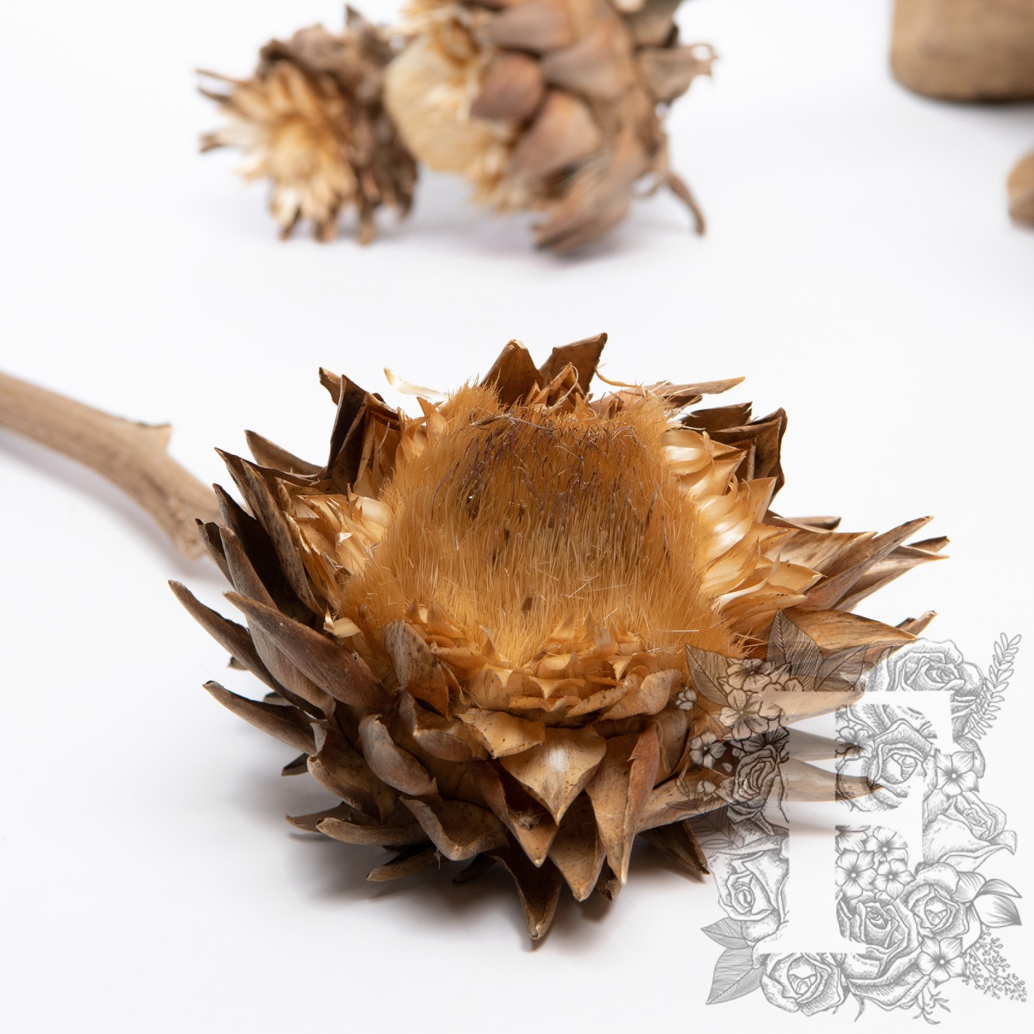 With layered petals, the Artichoke is a thistle from the sunflower family with a round head wrapped in sharp petals. The exotic but heritage nature of the dried Artichoke enhances corporate displays, hospitality, and office interiors creations with vivid texture.