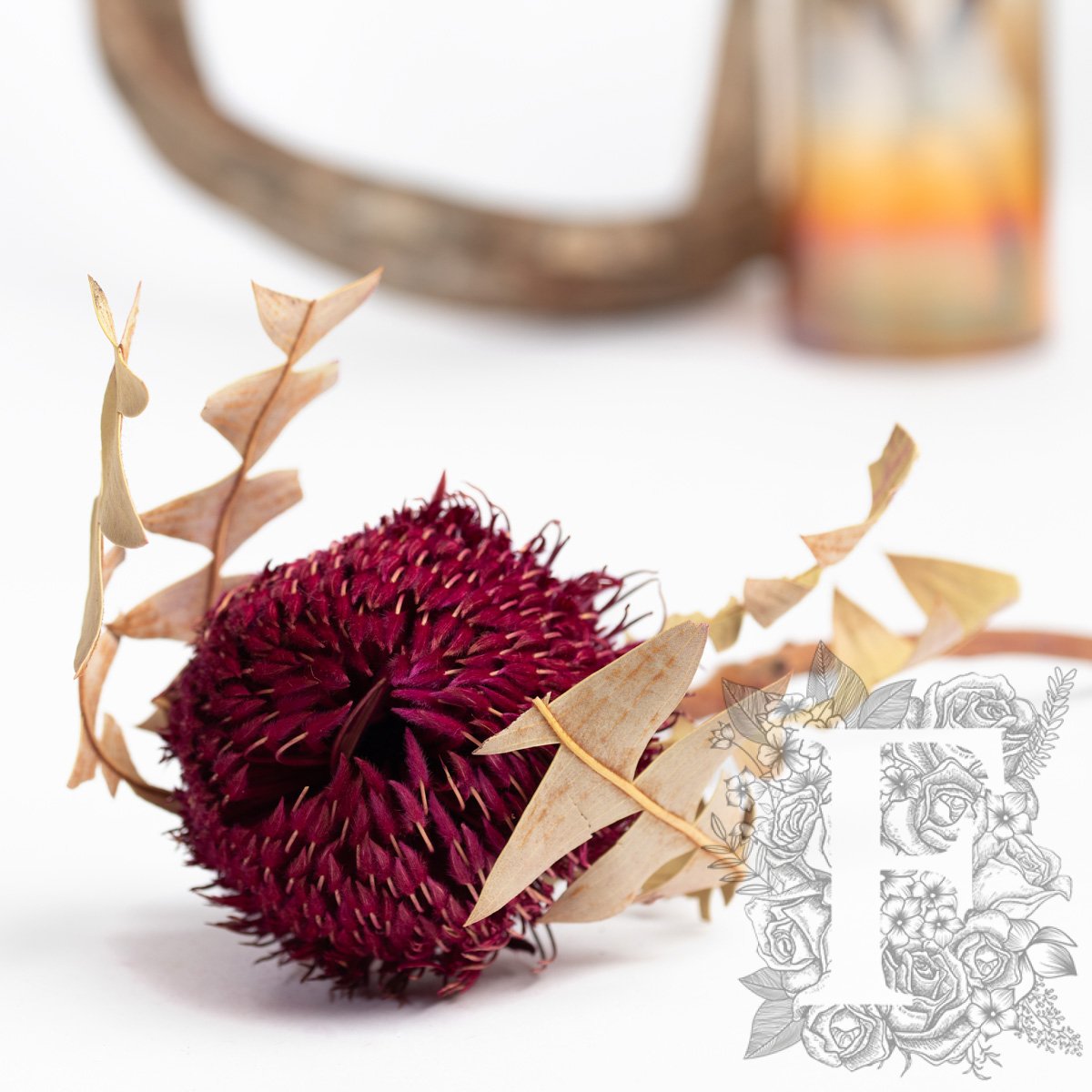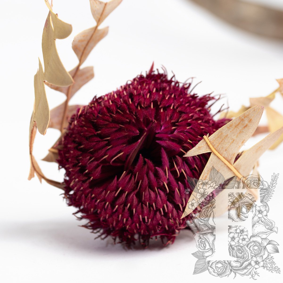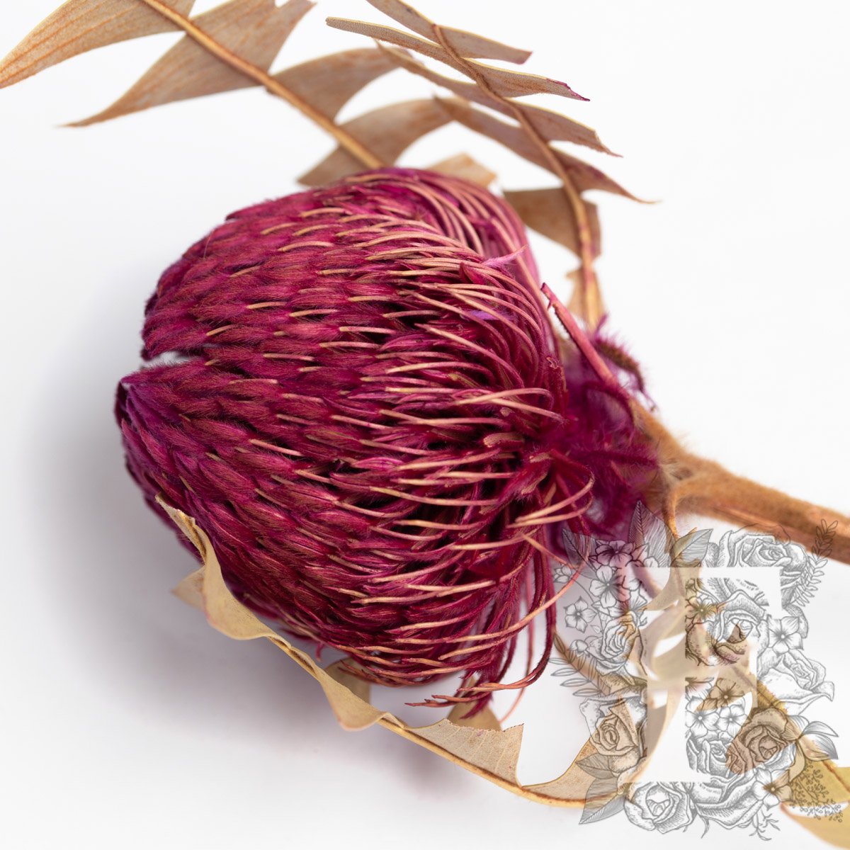 Endemic to Western Australia, the Banksia Baxteri. Unlike the Hookerana, the wider zigzag leaves, which the Baxteri has developed to ward off curious animals enhance the texture of this exotic statement flower.