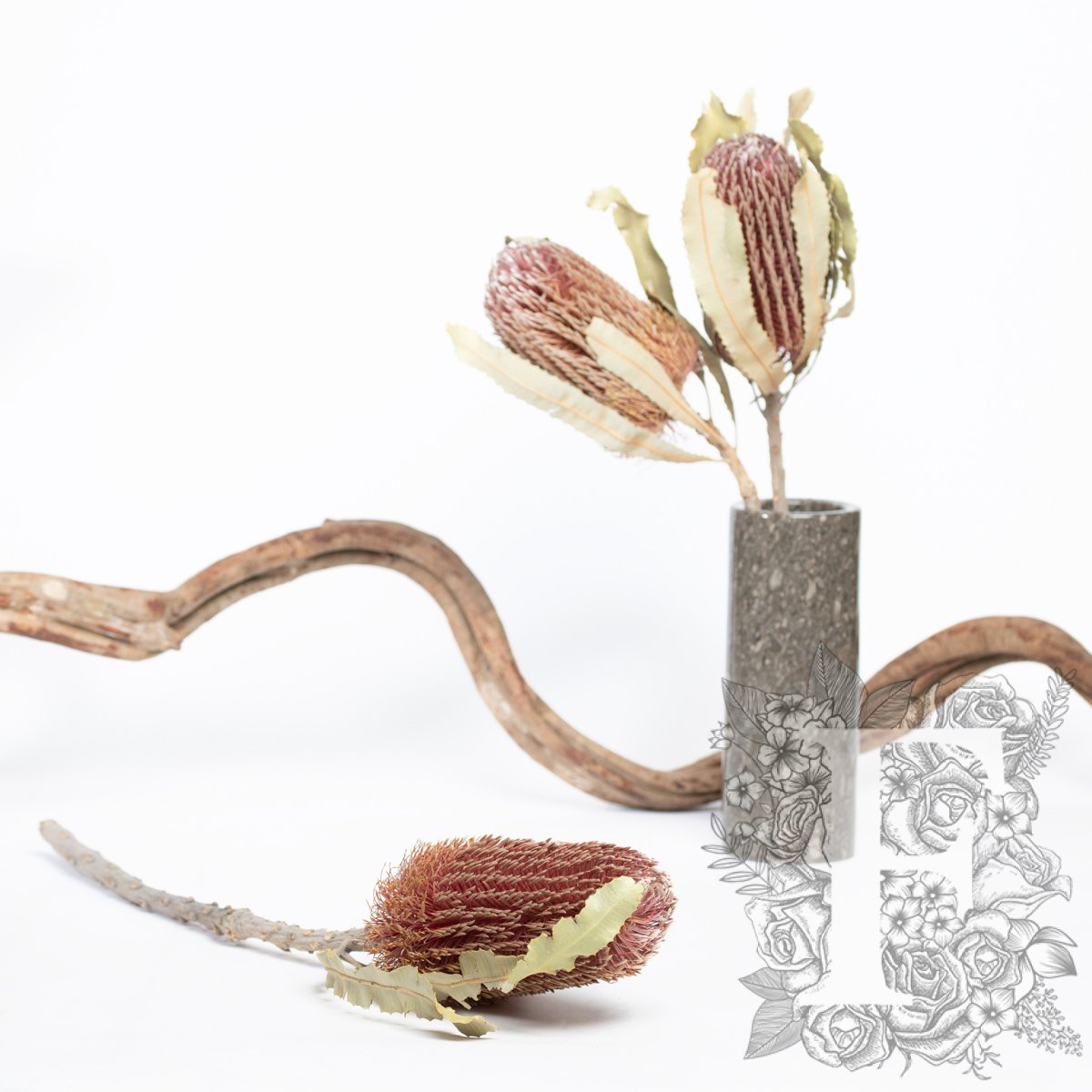 The exotic Banskia Menziesii is a dry flower, with thousands of tiny tendrils injecting a touch of rustic texture to your work. Available in warm toned neutrals, these preserved dry flowers are hugely versatile in the interior themes that they suit, being at home in a range of corporate, hospitality and home décor settings.