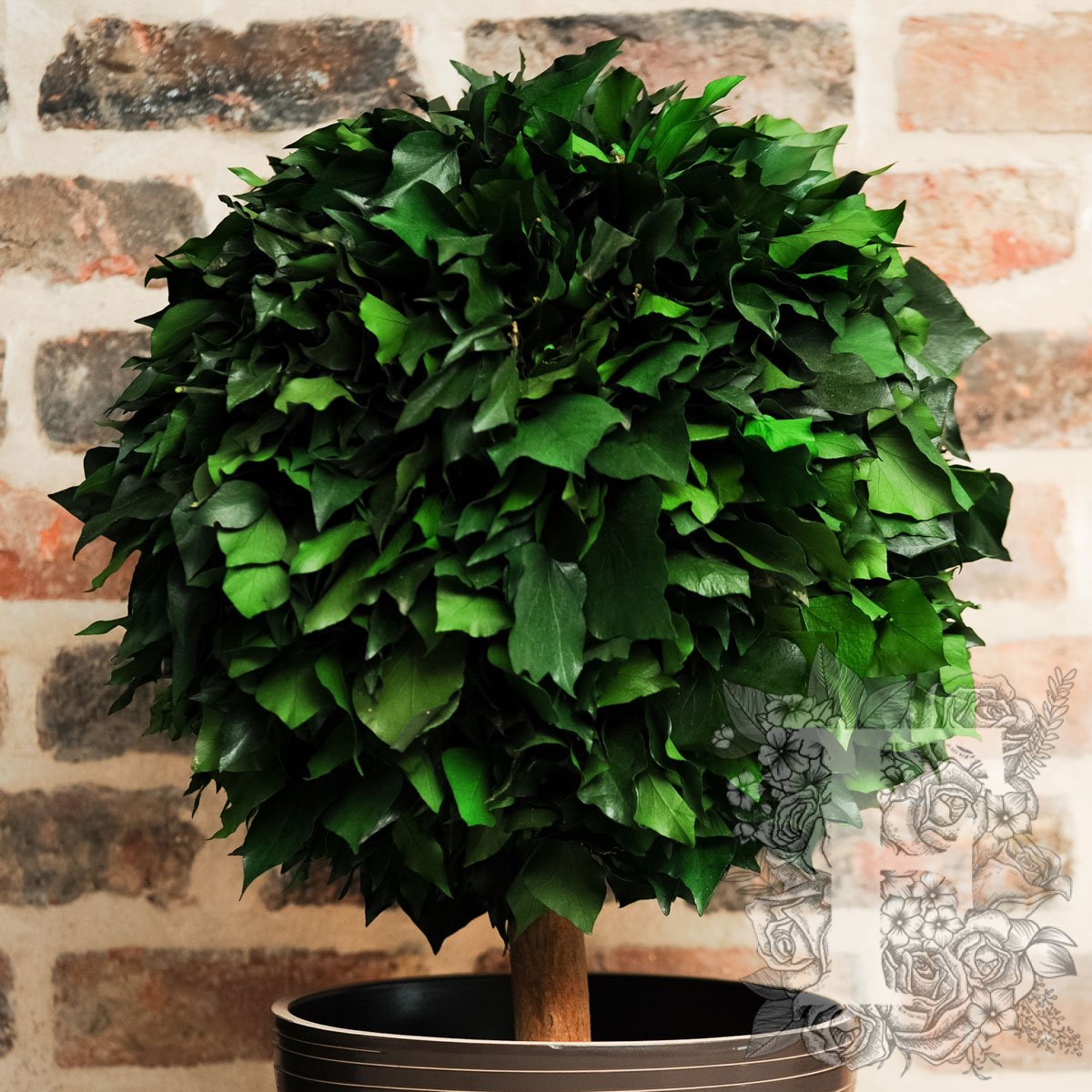 A short round bush of hedera leaves upon a thick round straight trunk, bursting outwards in a starburst effect, this small but dramatic piece can be used in a multitude of ways and makes a perfect addition to an entryway.