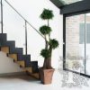 Thick, wooden trunks rise and split into four to allow four carefully created bushes of thuja leaves bursting outwards from a singular point to almost mimic the spherical topiary effect upon a natural trunk.