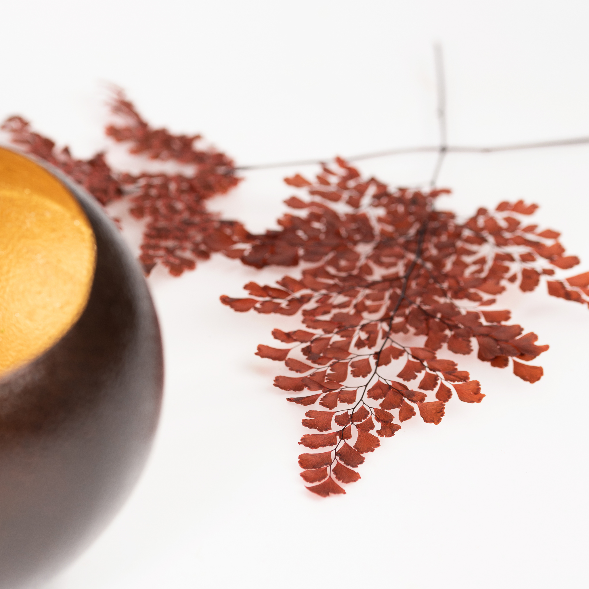 The preserved foliage Lutti Fern has flurries of small leaves on curved stems. This filler foliage comes in a red/orange shade, creating natural volume in seasonal autumnal, and countryside inspired displays. The intricacy of the leaves brings in textural elements to a space, ideal when adding depth to corporate and landscape settings.