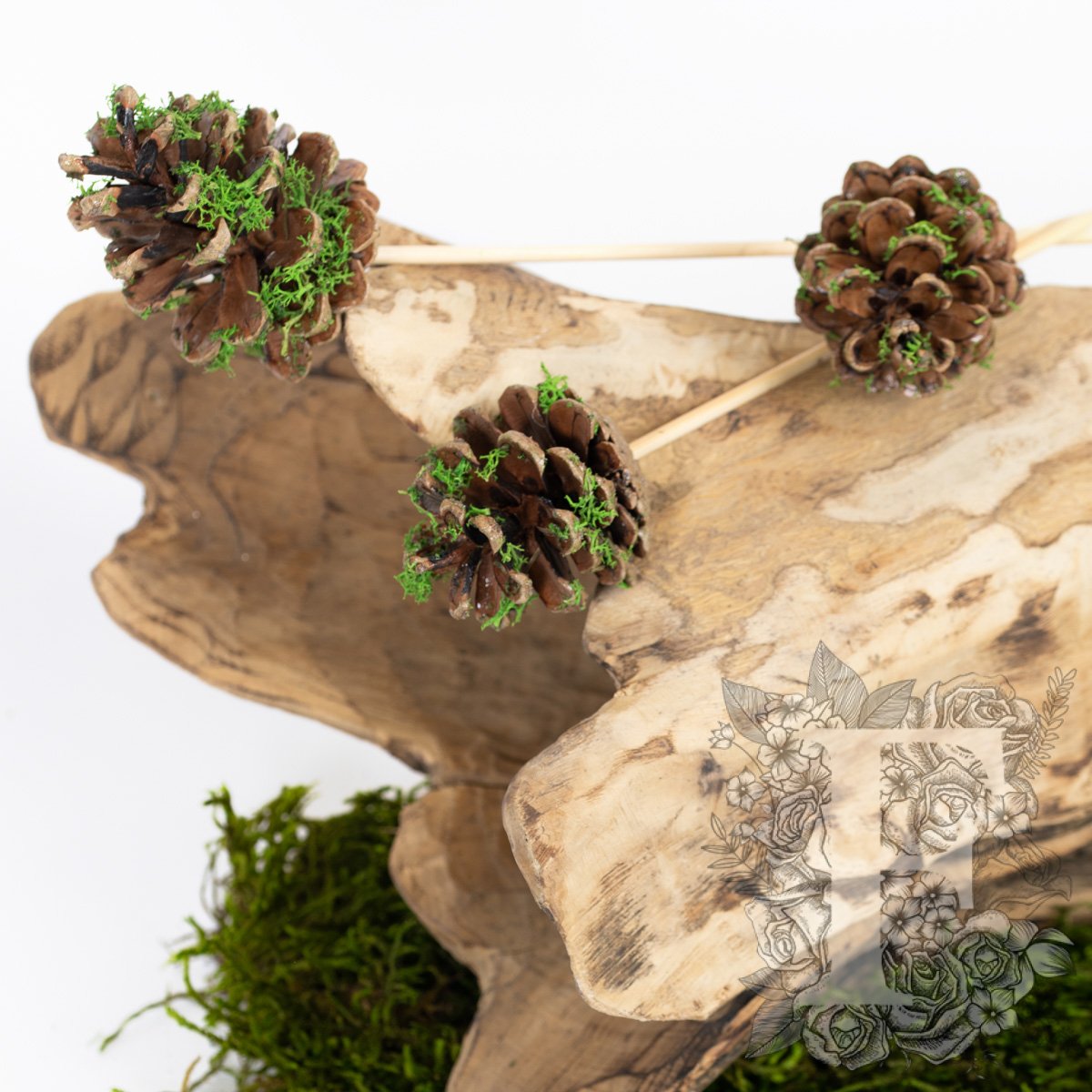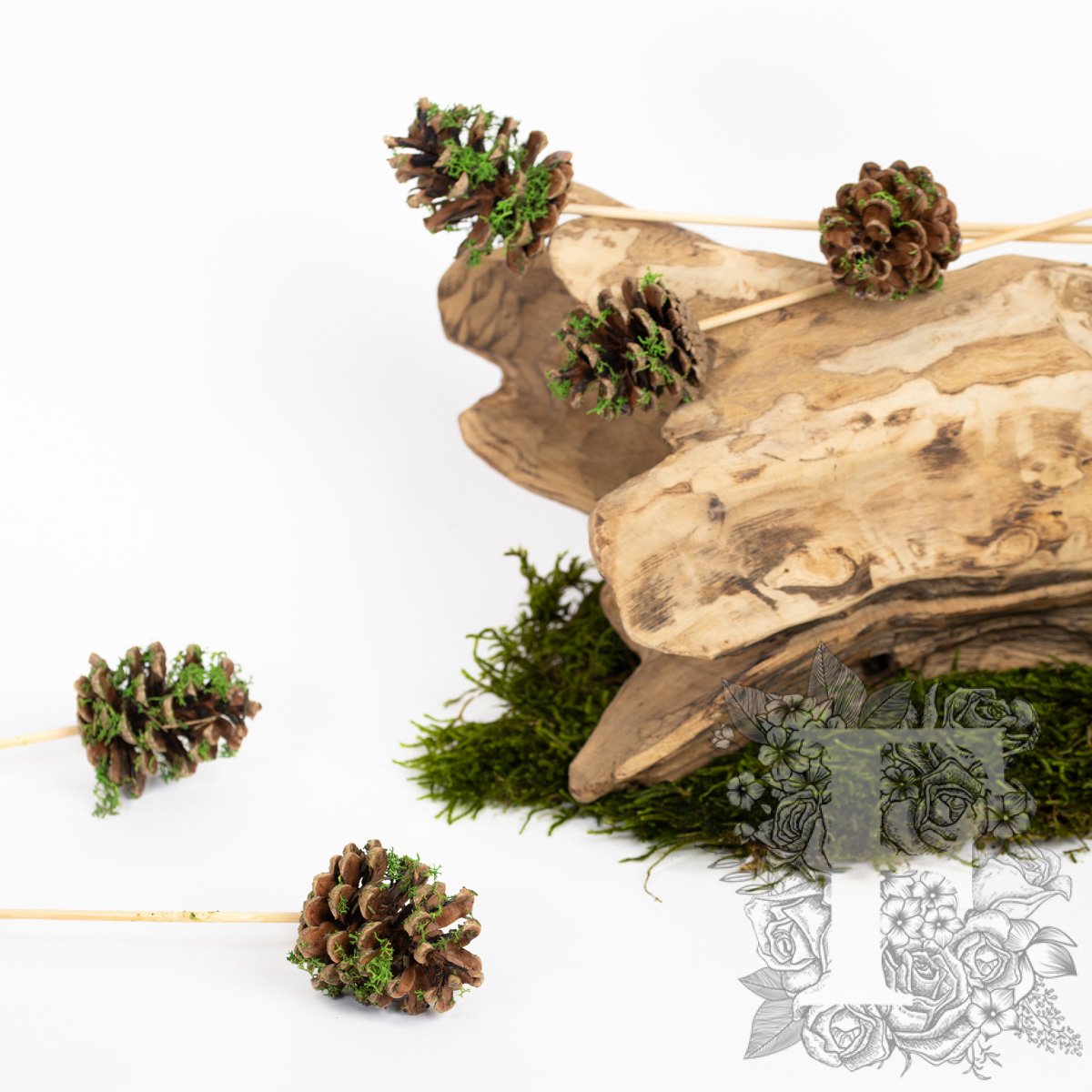 Rustic and textured, the pinecone with moss come mounted on wooden sticks to allow creative displaying in arrangements. Perfect for producing a woodland or autumnal inspired aesthetic, Moss Pinecone can style corporate interiors, home interiors and commercial displays.