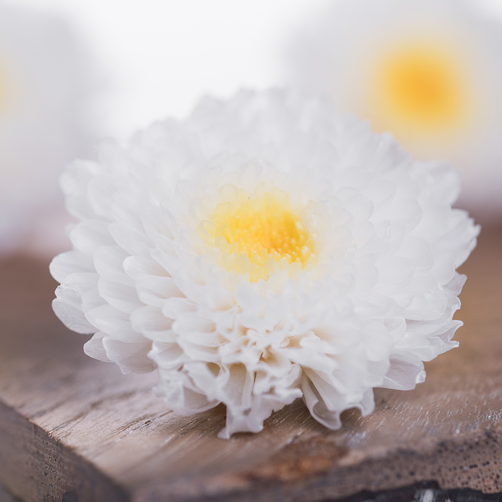 A semi-closed Chrysanthemum flower that is predominantly white with a central ombre of colour. Long petals curl around to create a round, ball-shaped flower with its soft beauty preserved.