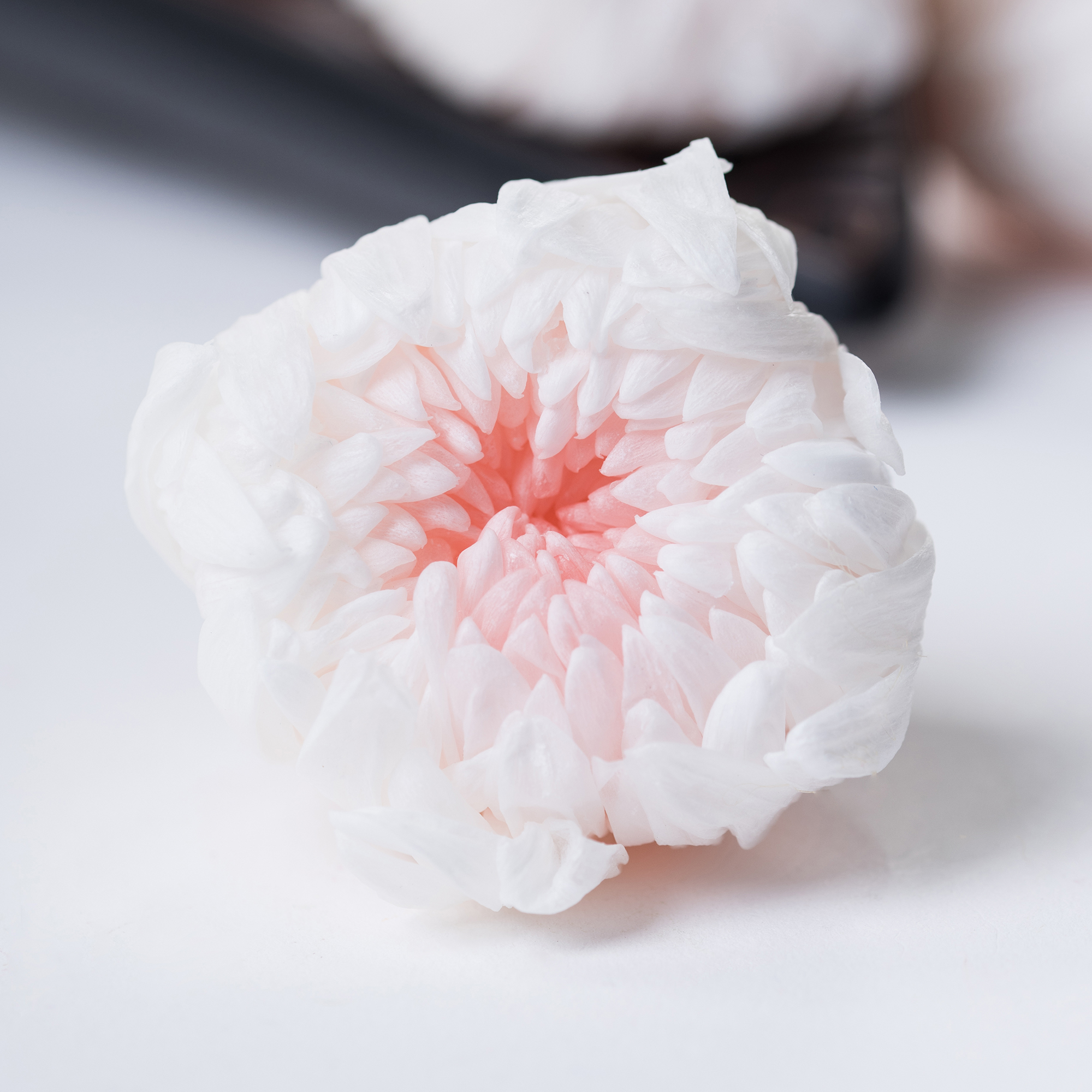 A semi-closed Chrysanthemum flower that is predominantly white with a central ombre of colour, available in green, purple and pink. Long petals curl around to create a round, ball-shaped flower with its soft beauty preserved.