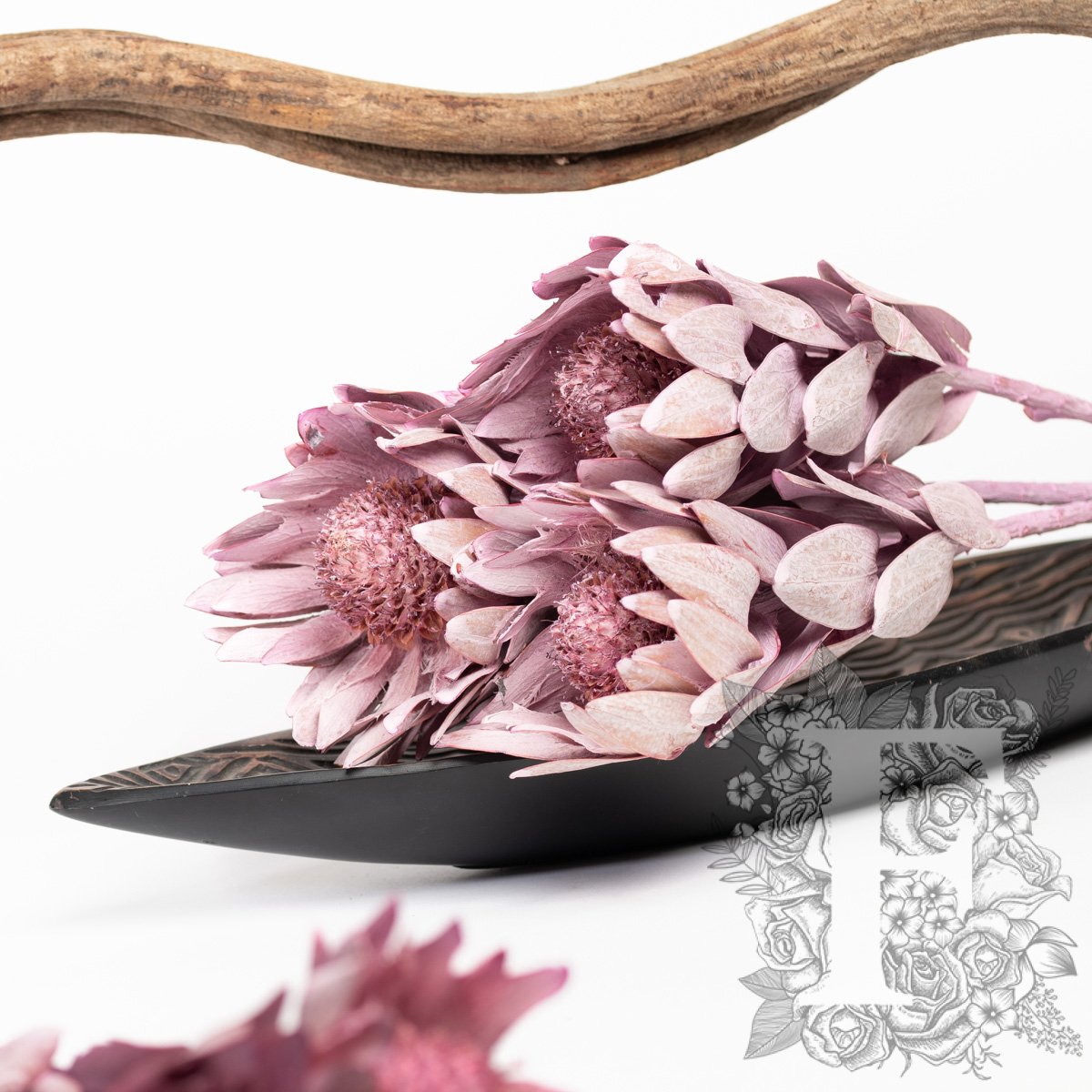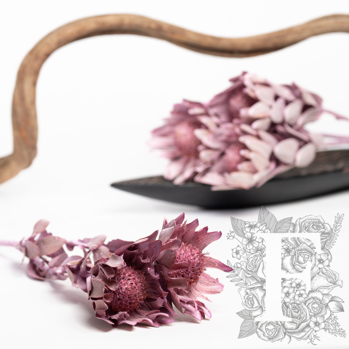 Nervosum branch is a species of tree native to Australia. Its cone like flowers are surrounded by terminal leaves with frosted tips. The stiff, colourful composition of of the preserved flower’s leaves help fill out arrangements with a unique looking addition and make it a great option for wreath making. Alternatively, why not utilise the frosted tip colour variations for winter themed décor, such as seasonal weddings.