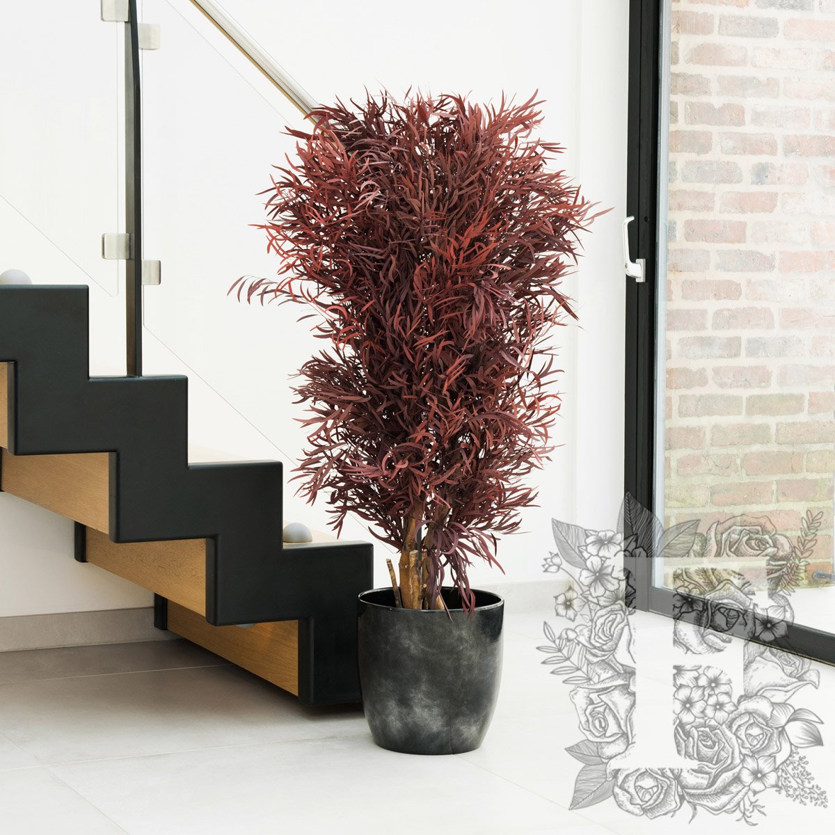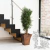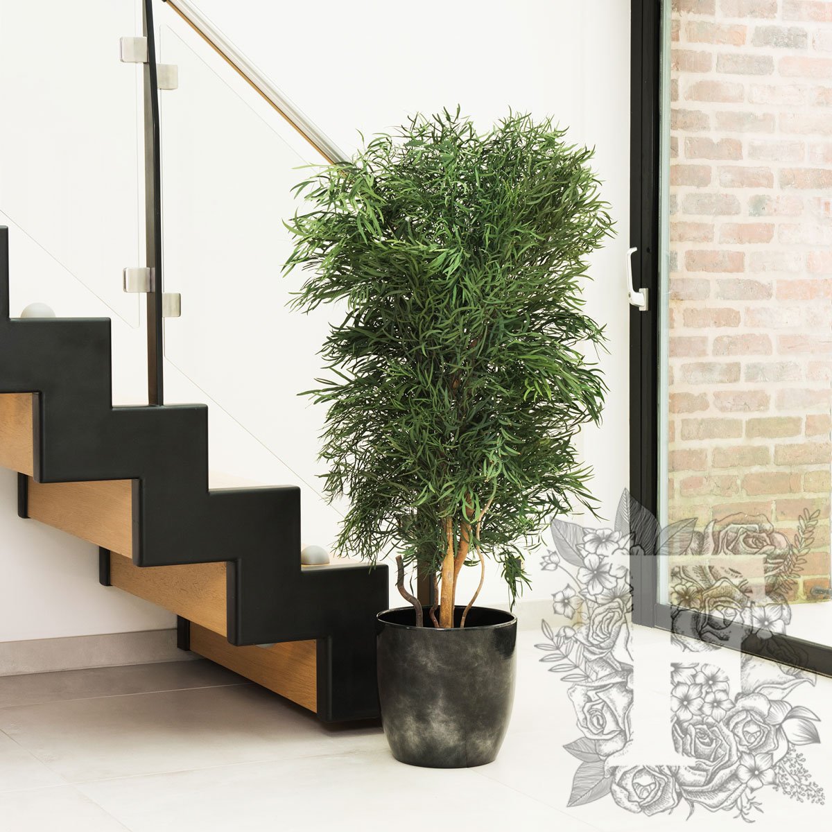 A beautifully exposed trunk with twisting ‘root’ like structures at the bottom, with a thick and full bush of Nicoly Leaves pointing upwards to create a narrow design, reaching a height of 1.3 meters.