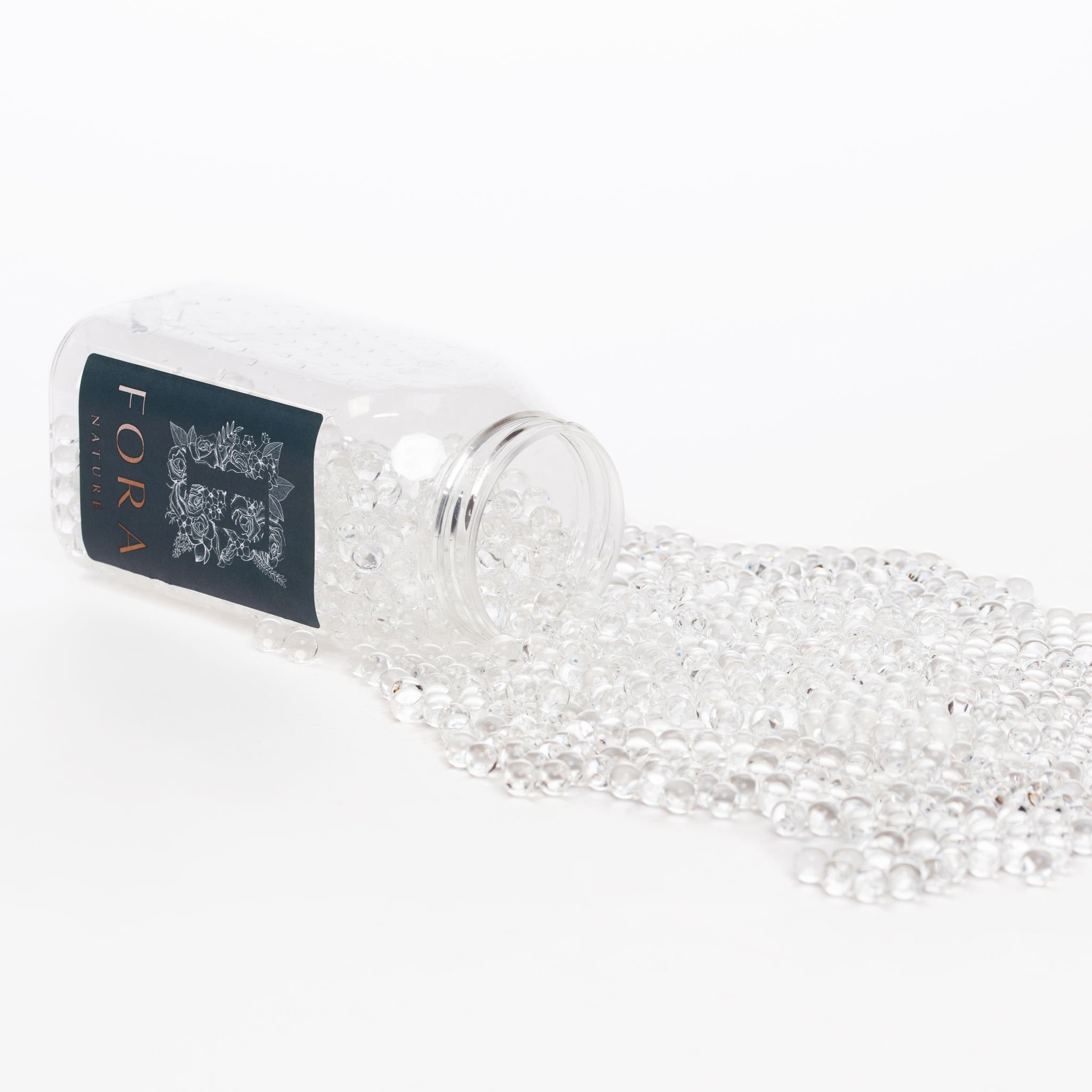 Pearl Gel Crystals are a neat accessory for NON preserved or dried flora. When placed at the bed of a plant decoration, these crystals absorb excess water and re-release it gradually overtime. Available in red, pink, or clear you can choose to add some vibrancy to your creations or let the crystals work their magic anonymously.