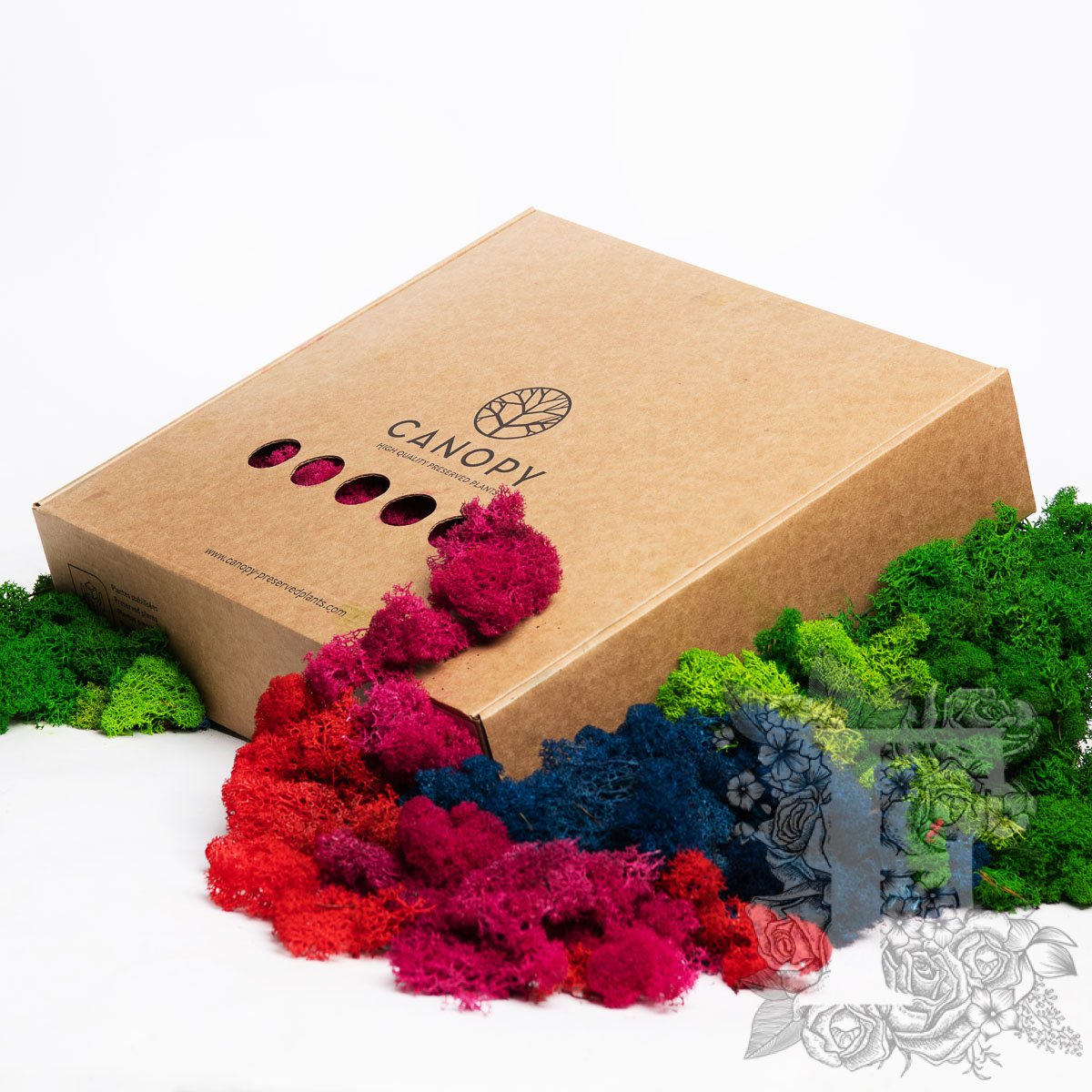 A foamy type textured moss that in its natural form serves as pasture for Reindeer and many other northern American grazing animals. Once harvested, this moss is treated with heavy pigmentation to allow such striking colours to shine through and remain bold and bright.