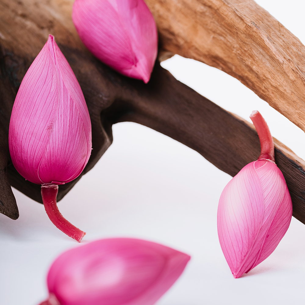 The Lotus flower is one that has always captured attention, and these preserved alternatives are no different. Captured in their closed form, the petals curl around each other protectively to create a strong structured head.