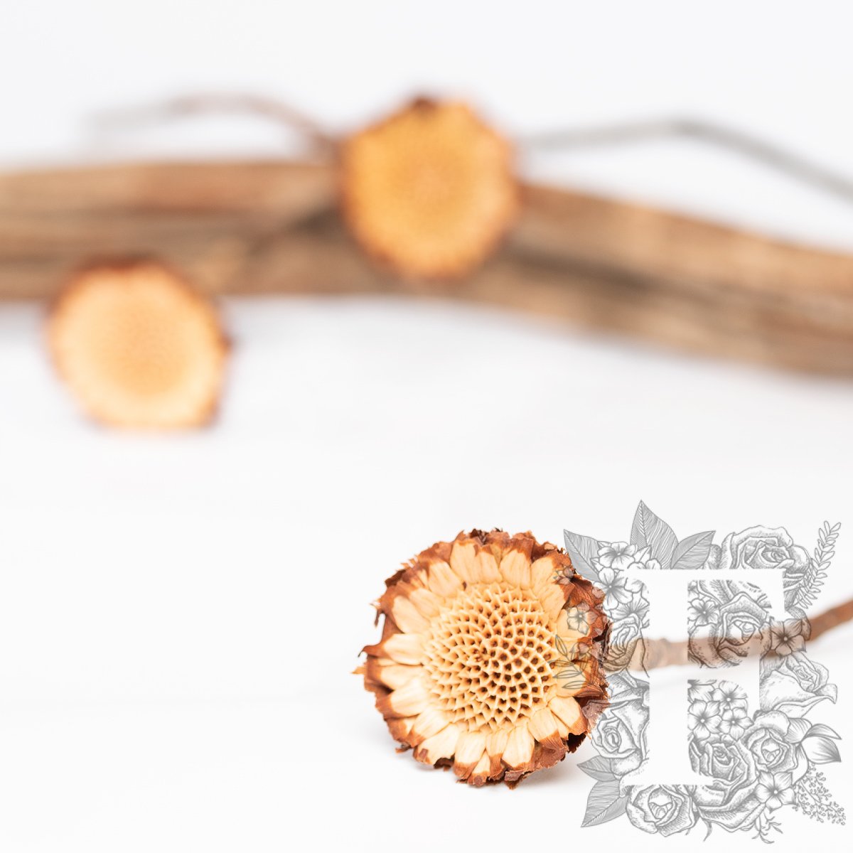 The Rosetta Compacta is a unique, intricate dry flower. With a long slim stem, the head of this flower has a detailed textured centre.
