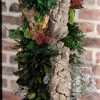 A long, totem-like structure composed from a very naturally textured trunk of wood create the perfect frame for a full display of greenery and filler flowers. Made to mimic the appearance of a forest floor, colours such as greens, greys, reds and subtle creams combine to make a fun and entertaining ‘natural’ look display.